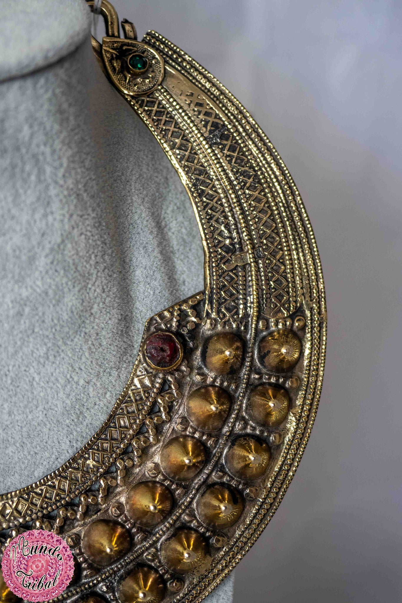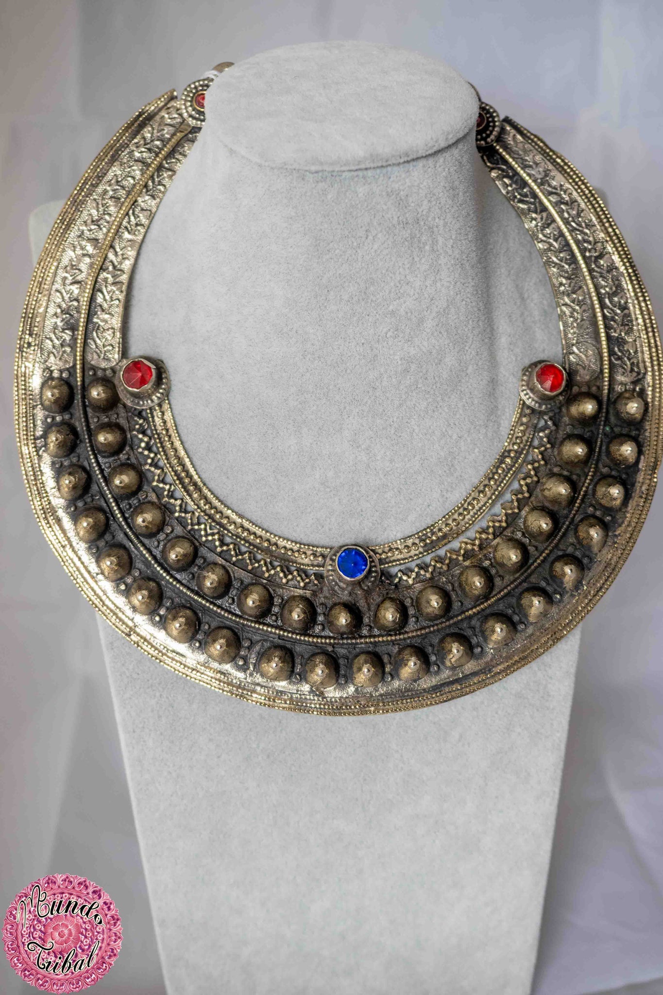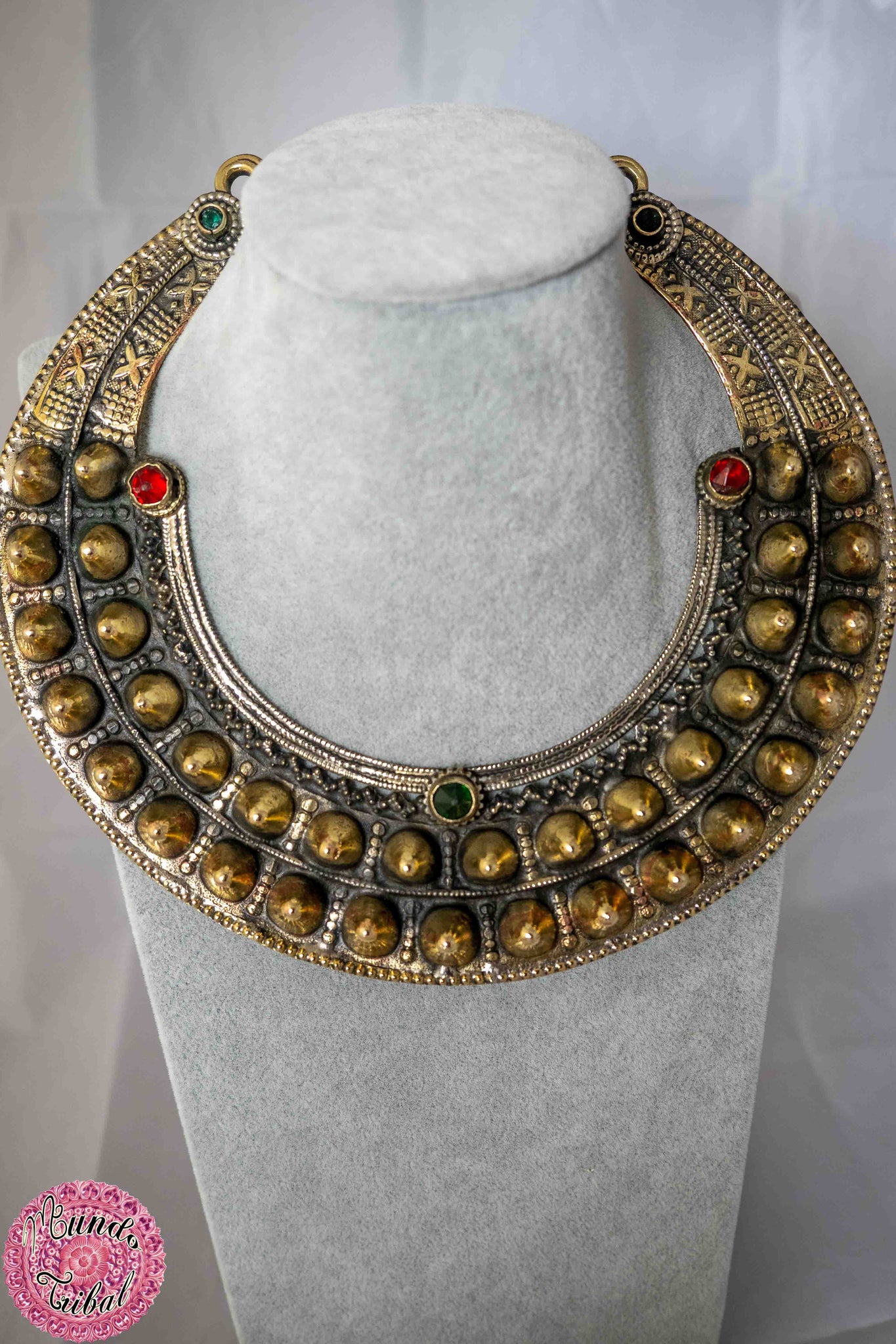 Imperioso collar Kuchi afgano de una pieza con pinchos y tres cristales incrustados.