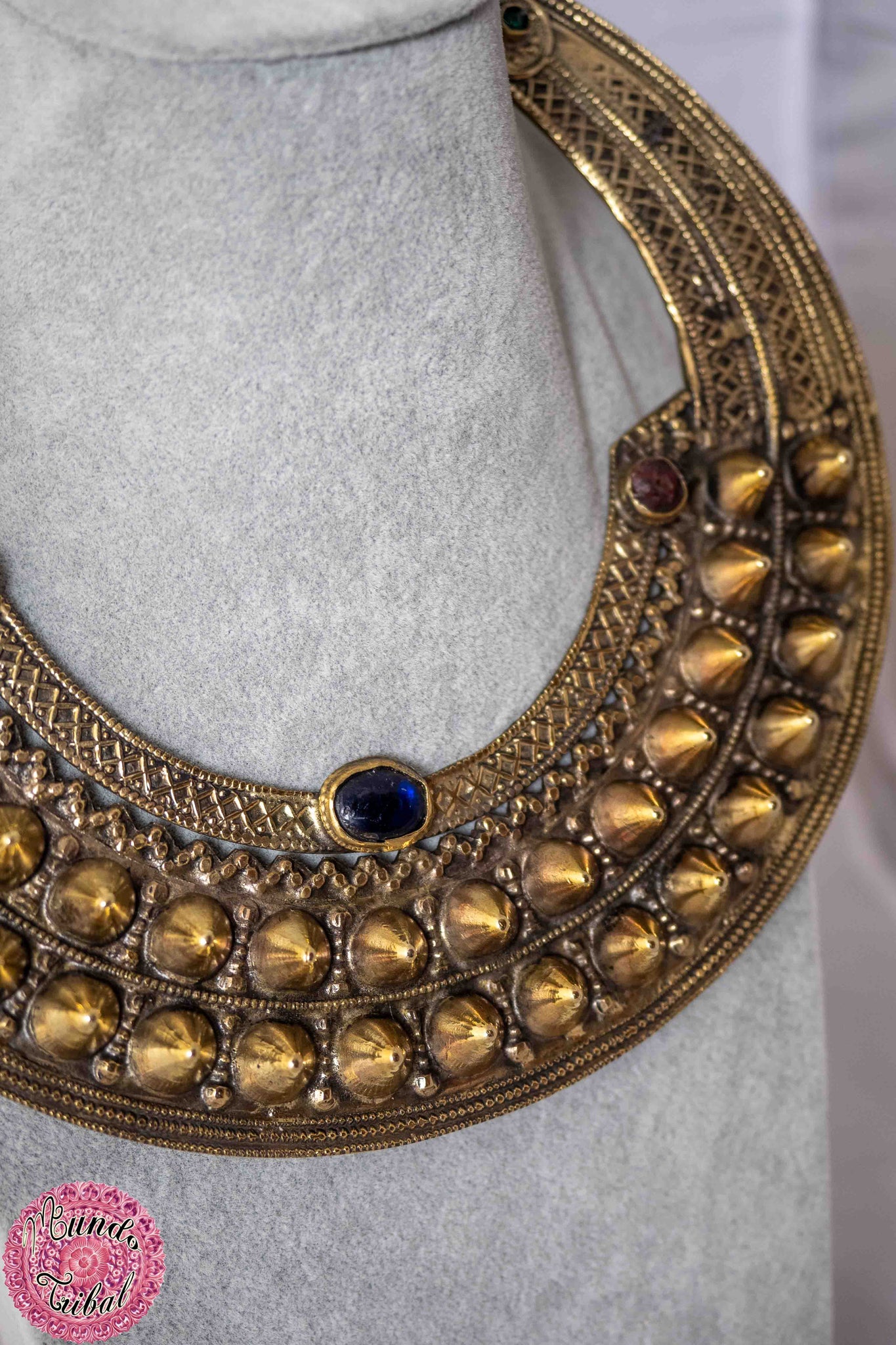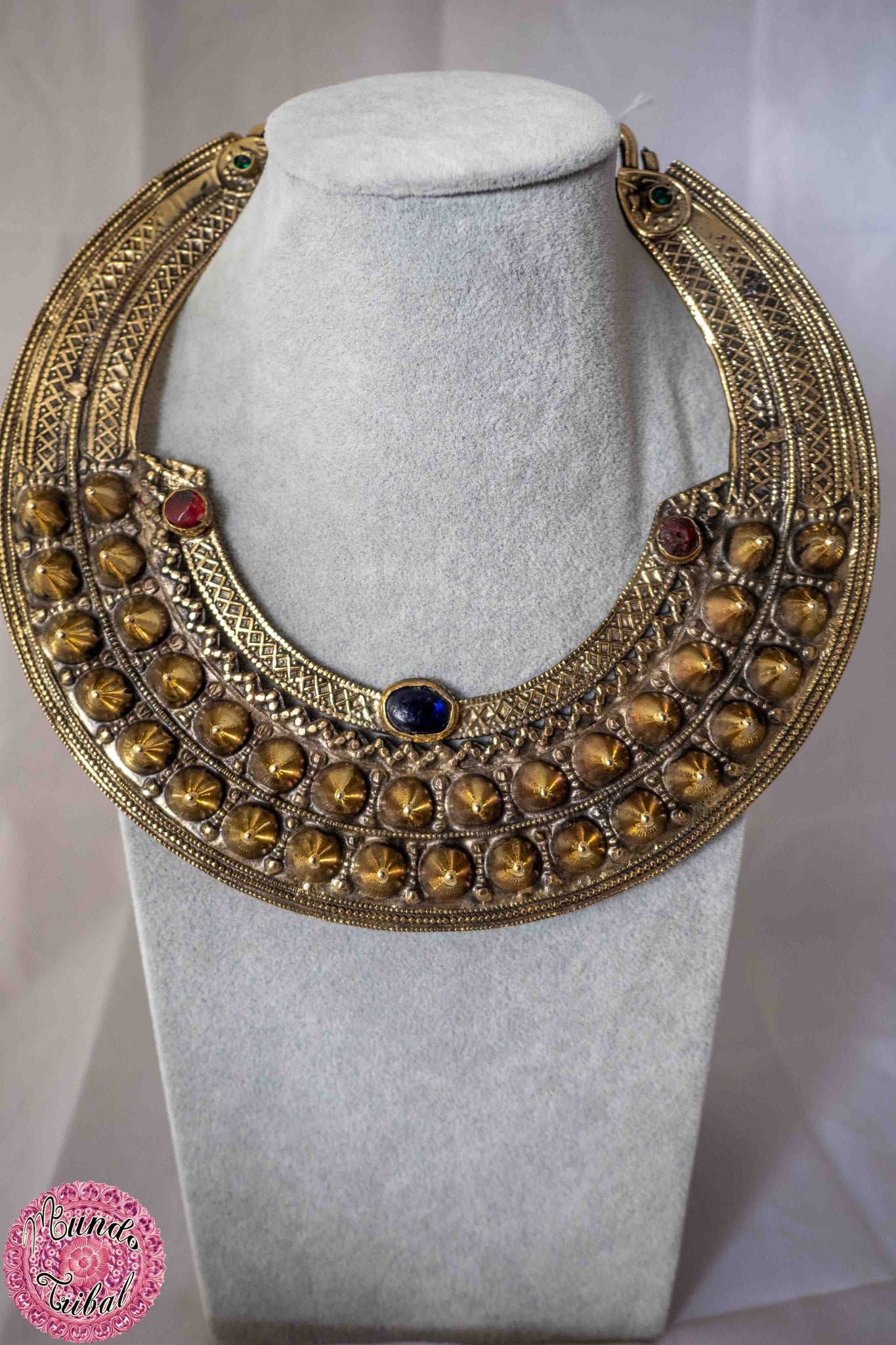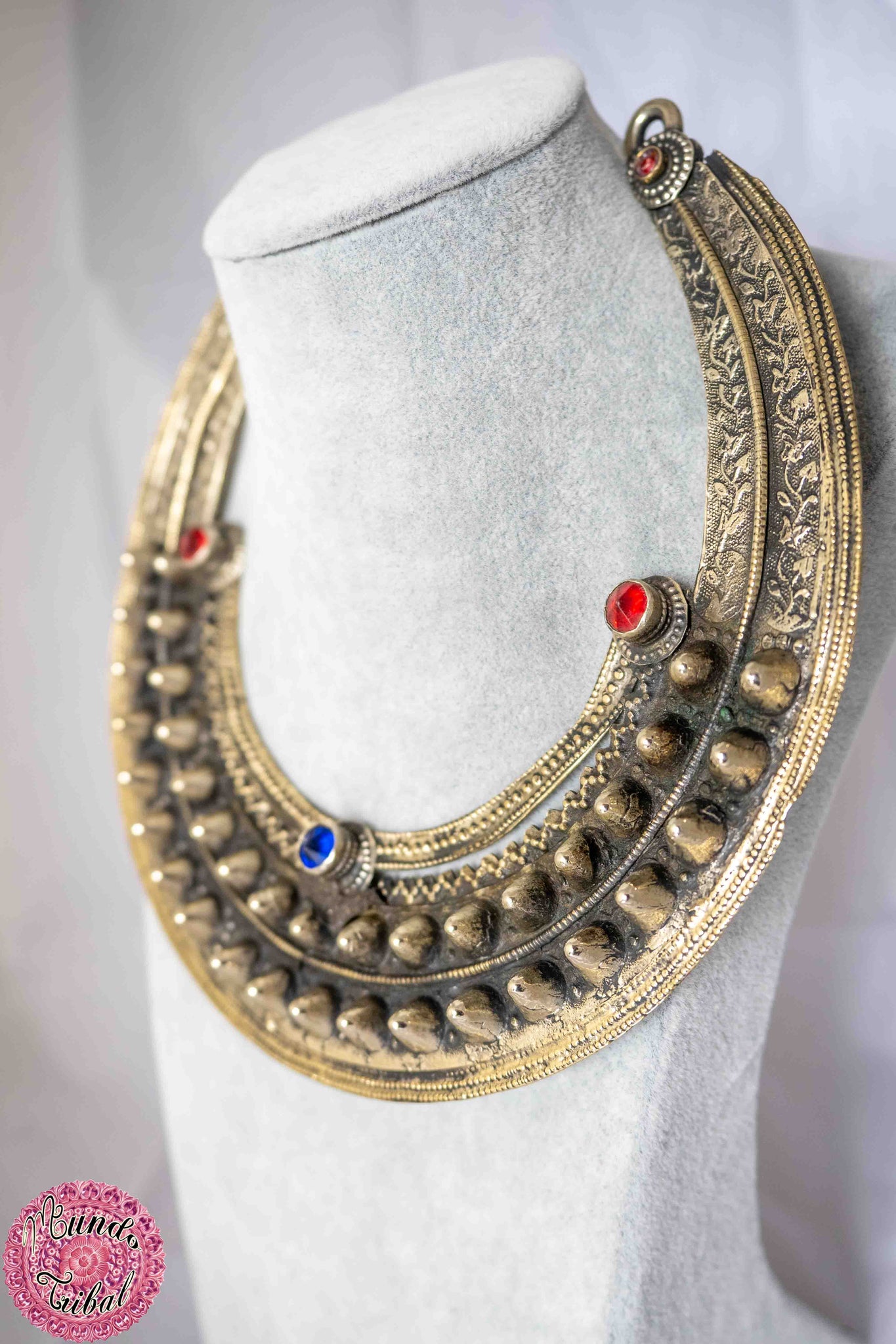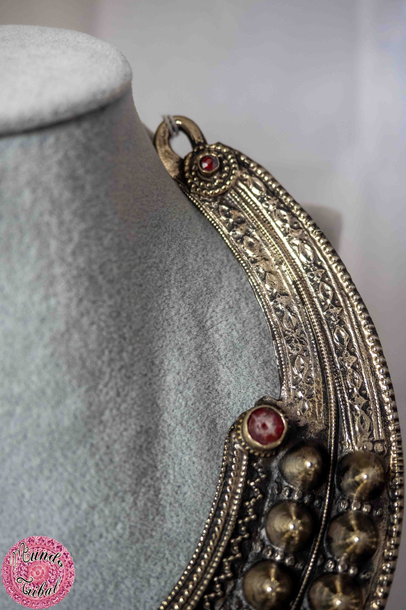 Imperioso collar Kuchi afgano de una pieza con pinchos y tres cristales incrustados.