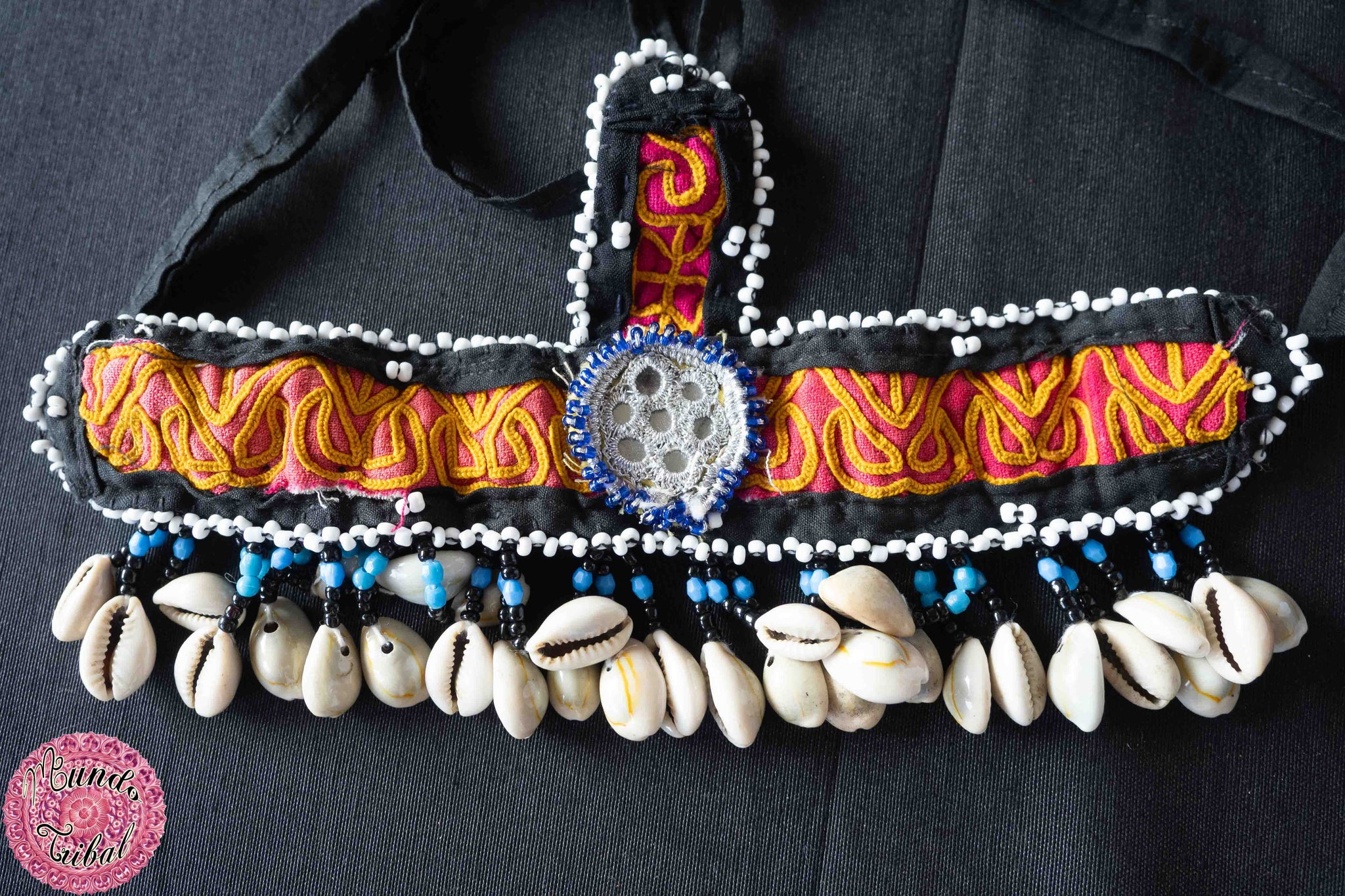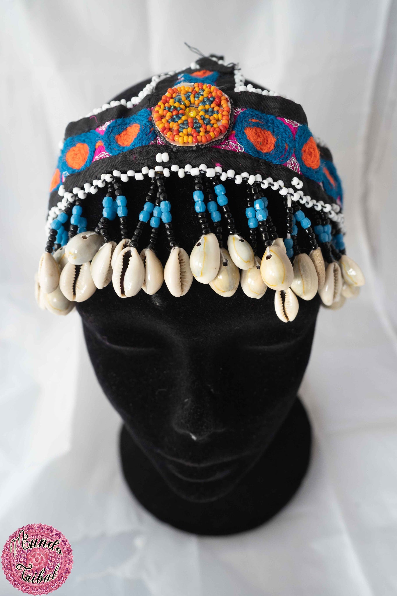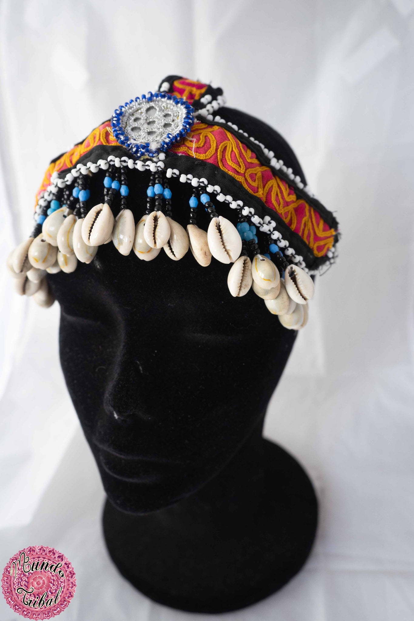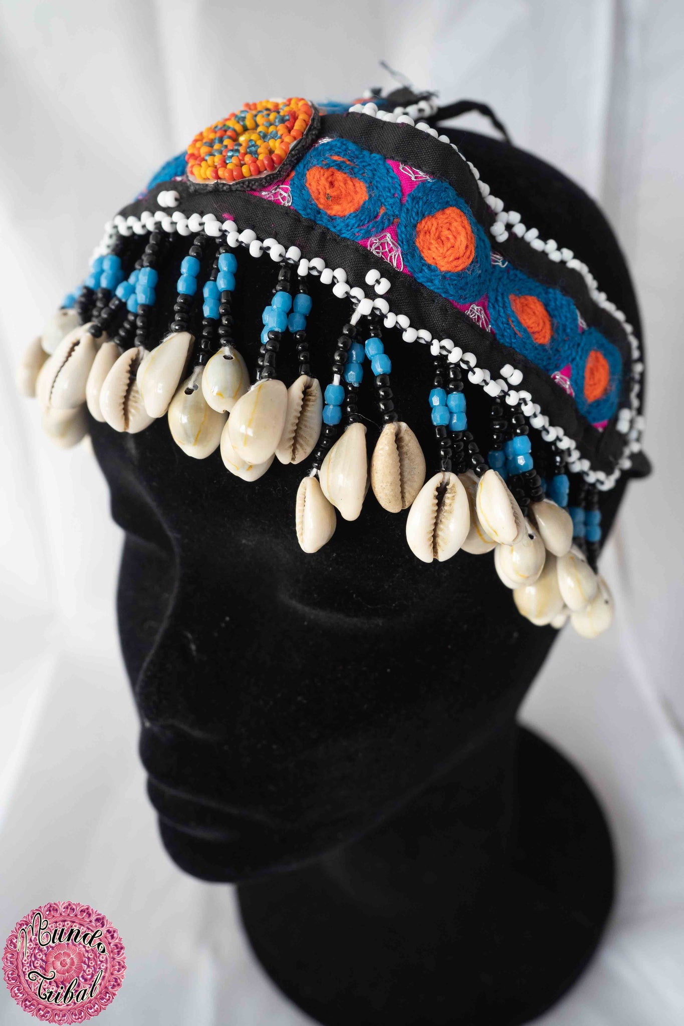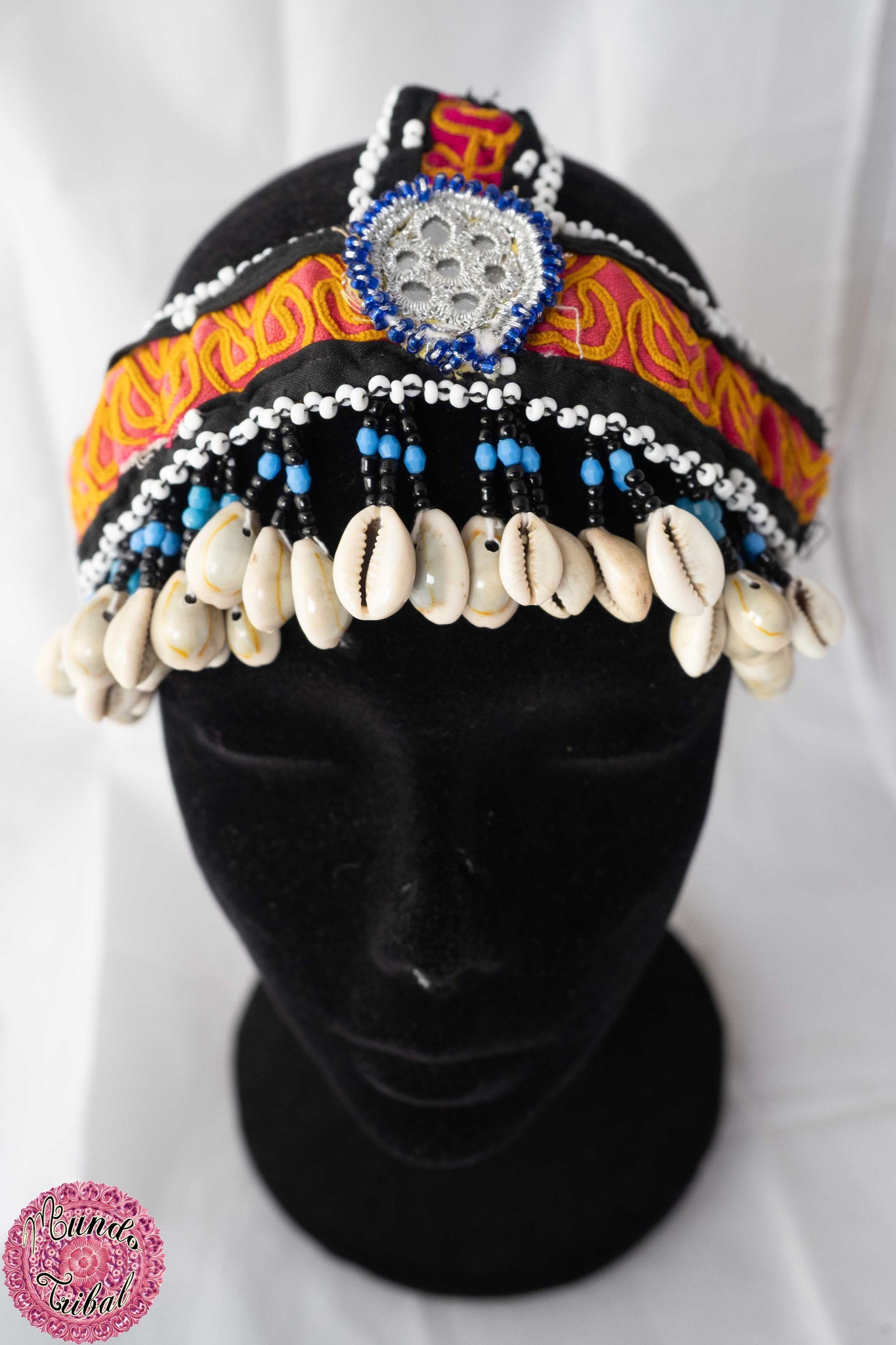 Tocado Kuchi de tela con medallón y conchitas. Ideal para tus eventos y actuaciones de danza tribal, sobre peinado o turbante.