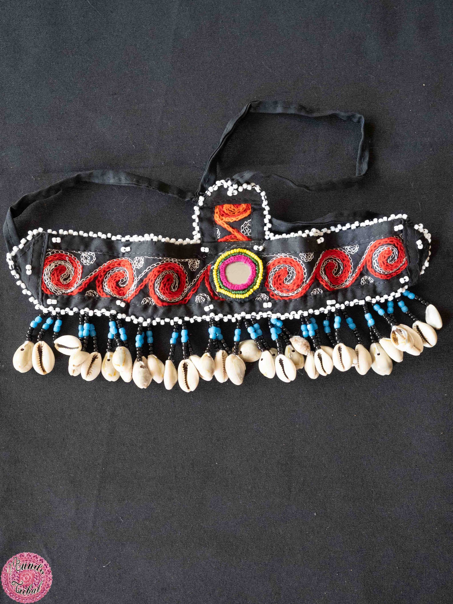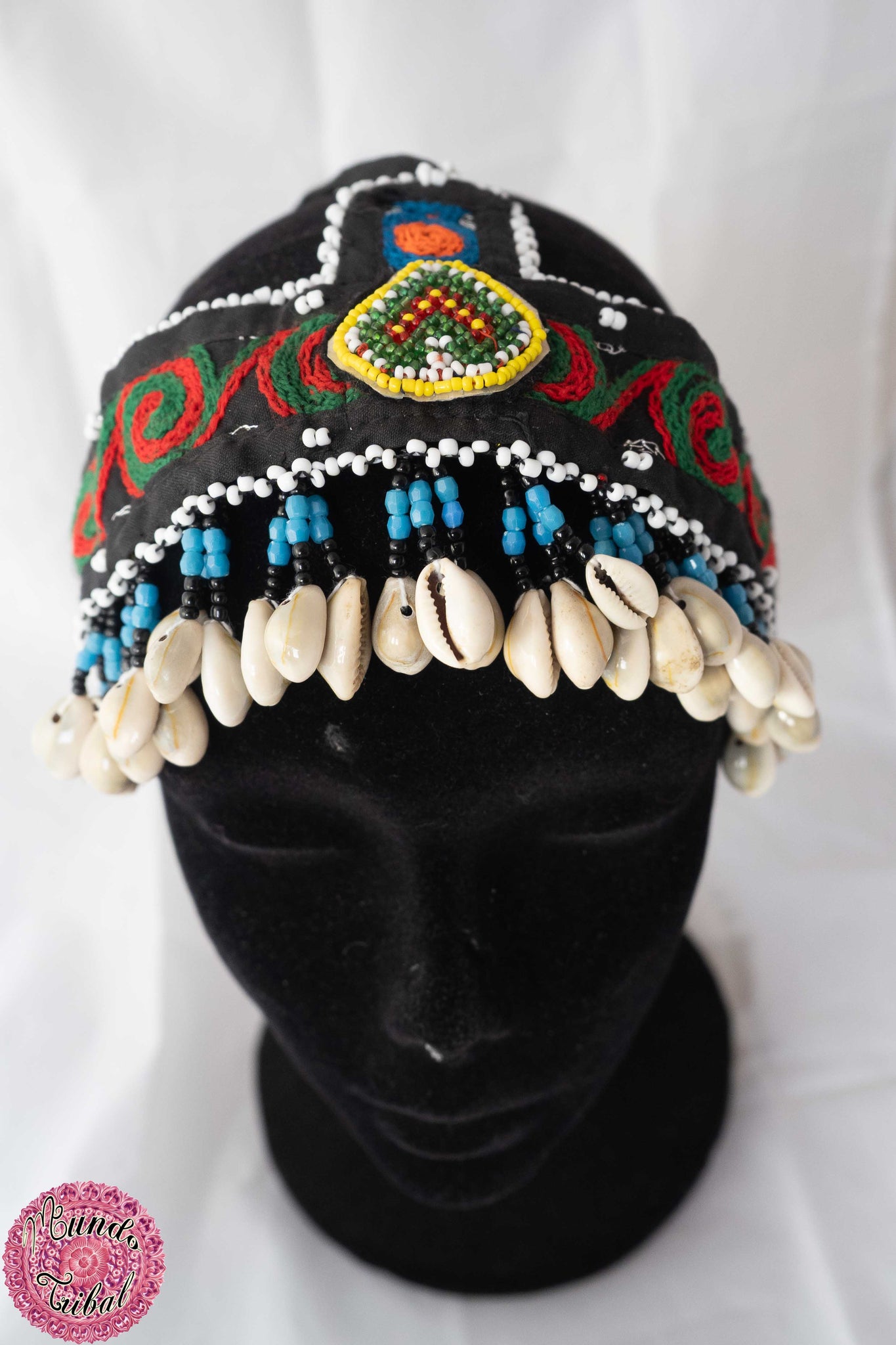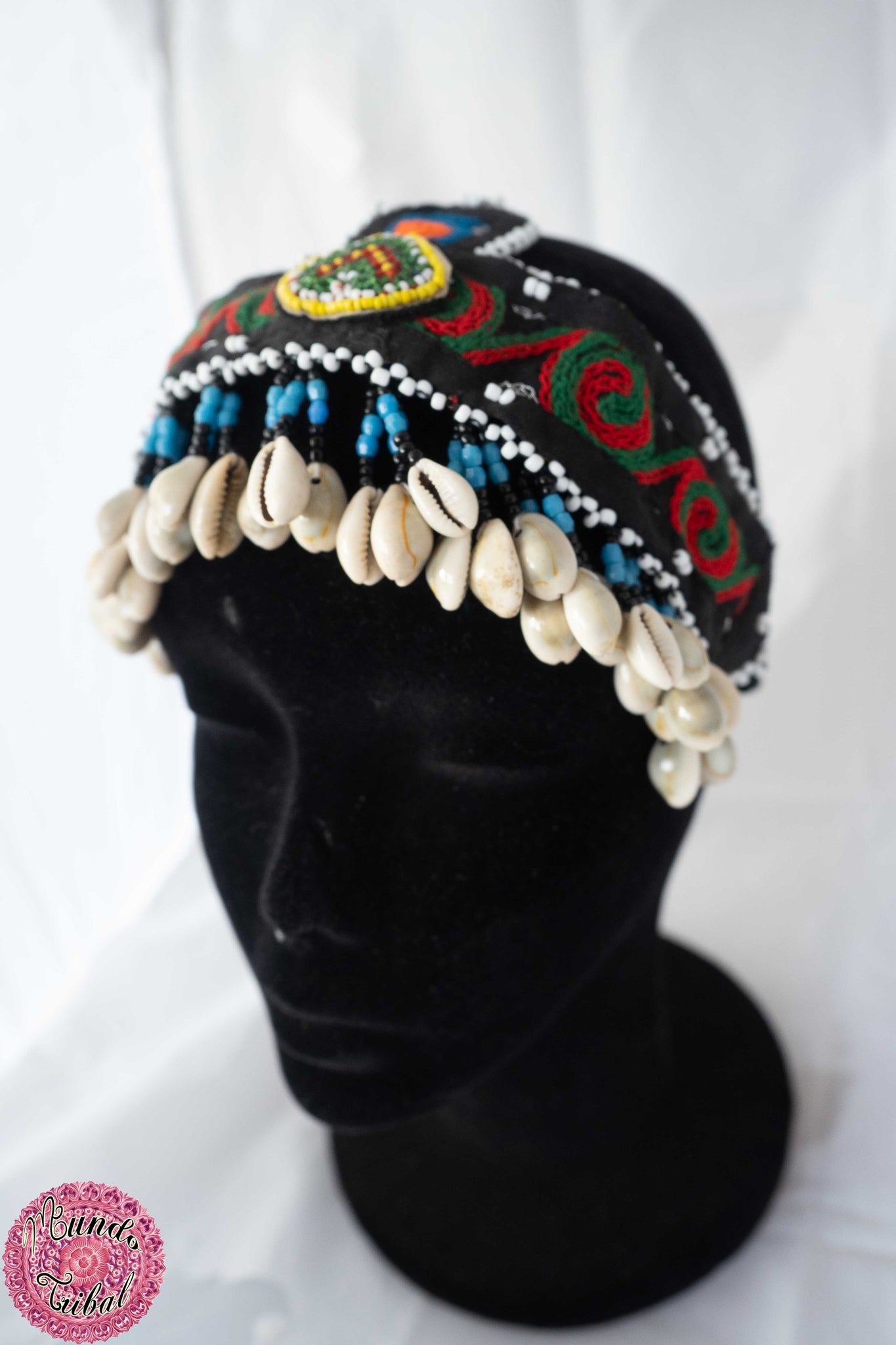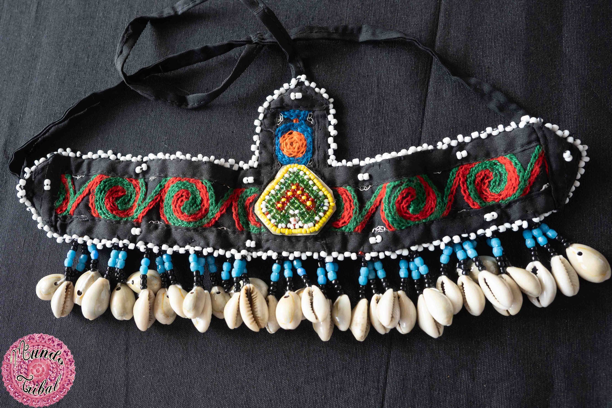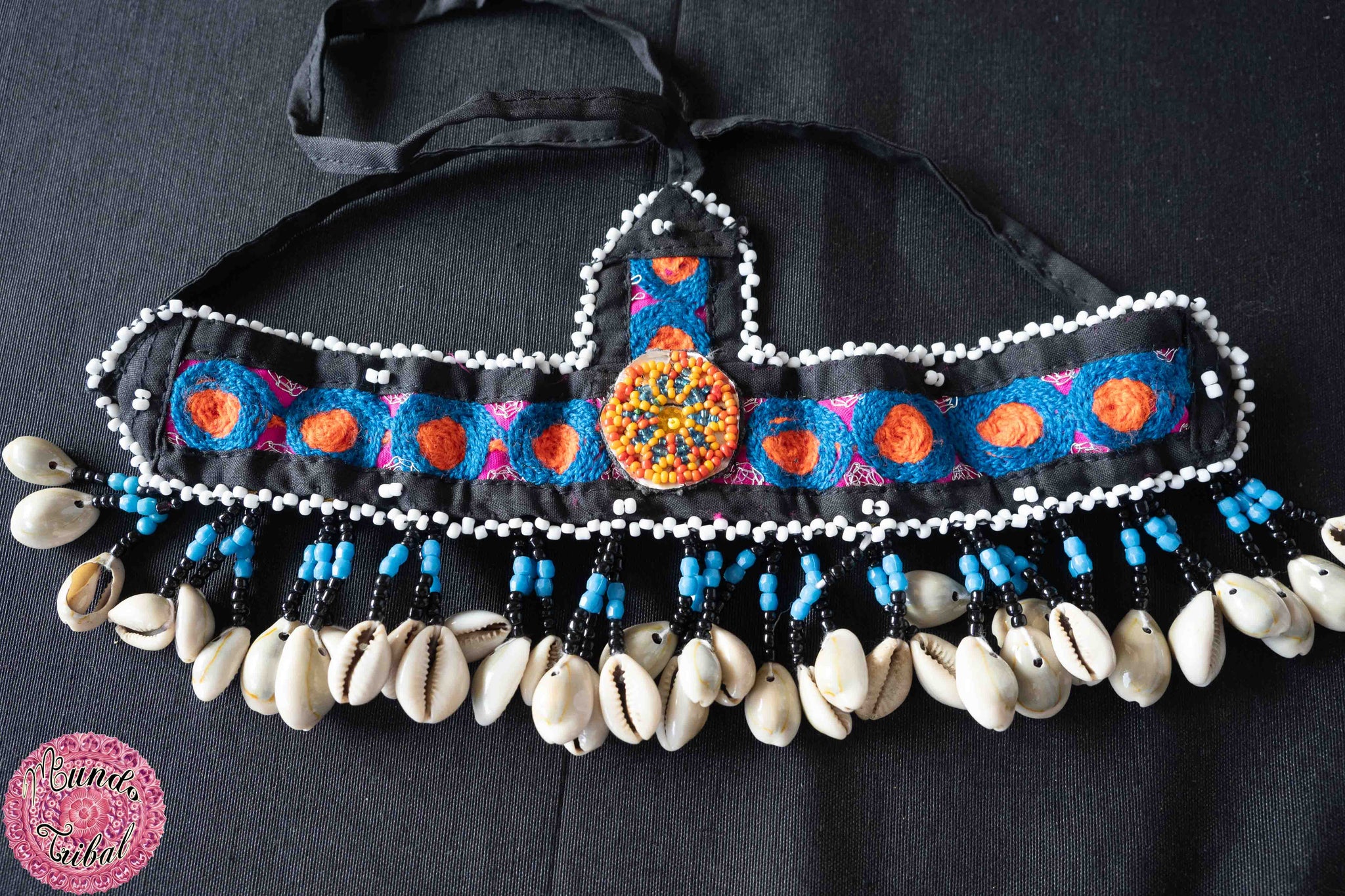 Tocado Kuchi de tela con medallón y conchitas. Ideal para tus eventos y actuaciones de danza tribal, sobre peinado o turbante.