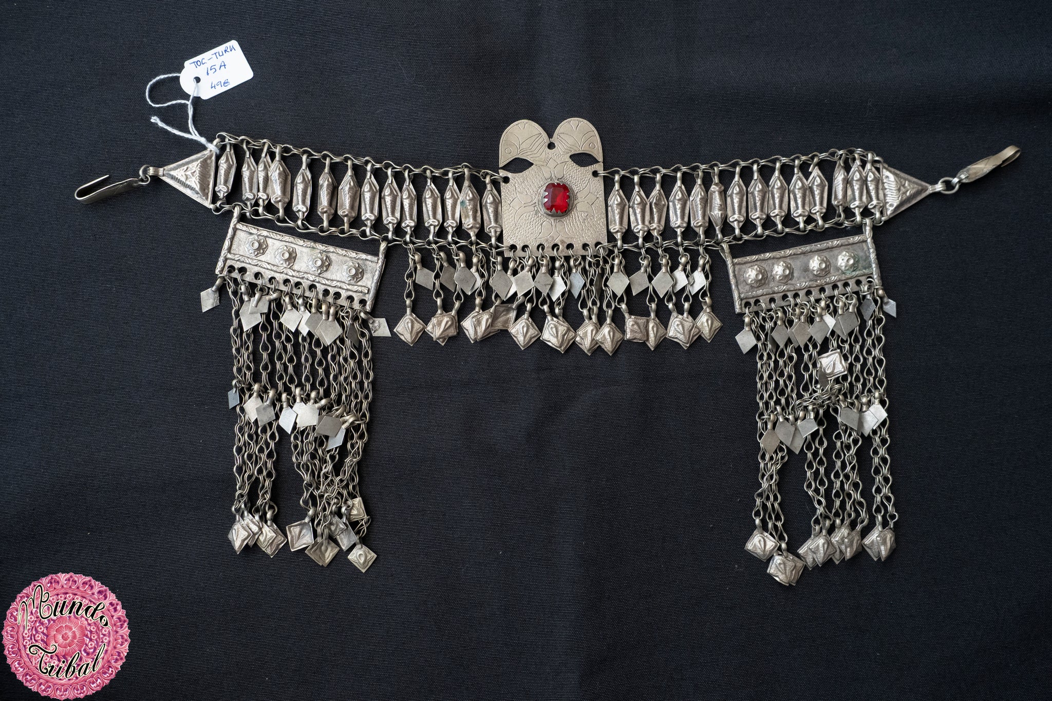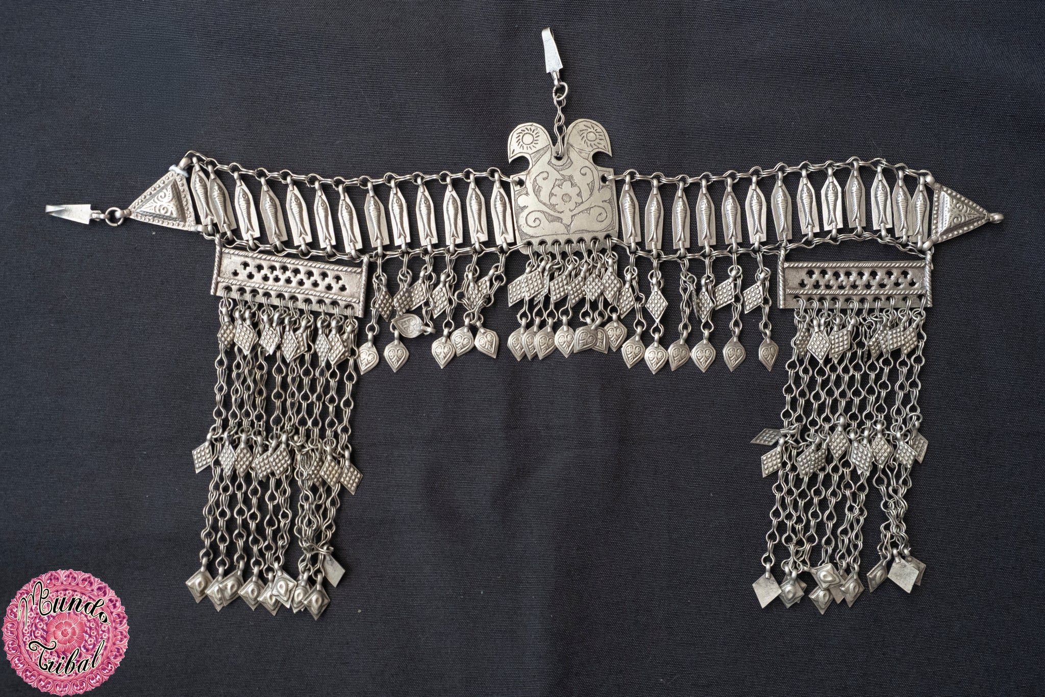 Enormes tocados estilo turkmaní o turcomano (diademas y cuelgues laterales).