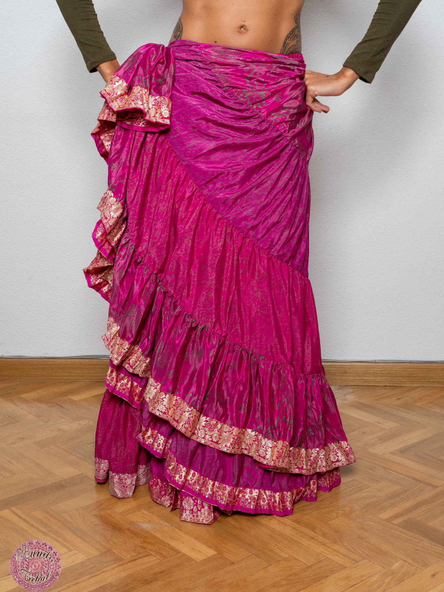NOTA: estos saris son reciclados: ya vivieron su época como sari en India, y que hemos reconvertido en esta espectacular falda. Al no ser tela nueva, puede presentar algún desperfecto. Si fuese el caso, suelen ser imperceptibles o muy discretos.