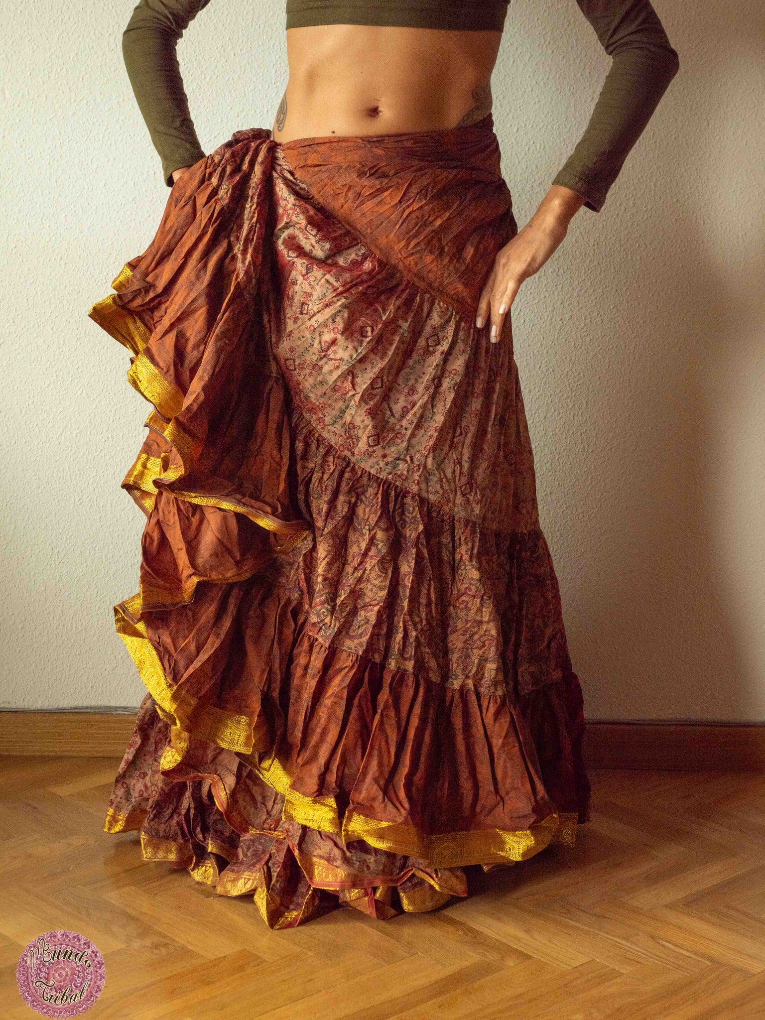 Faldas extra vuelo (más de 25 yardas) de tela sari especial estampada, súper ligera con un vuelo espectacular, perfecta para danza tribal, zíngaras, etc..