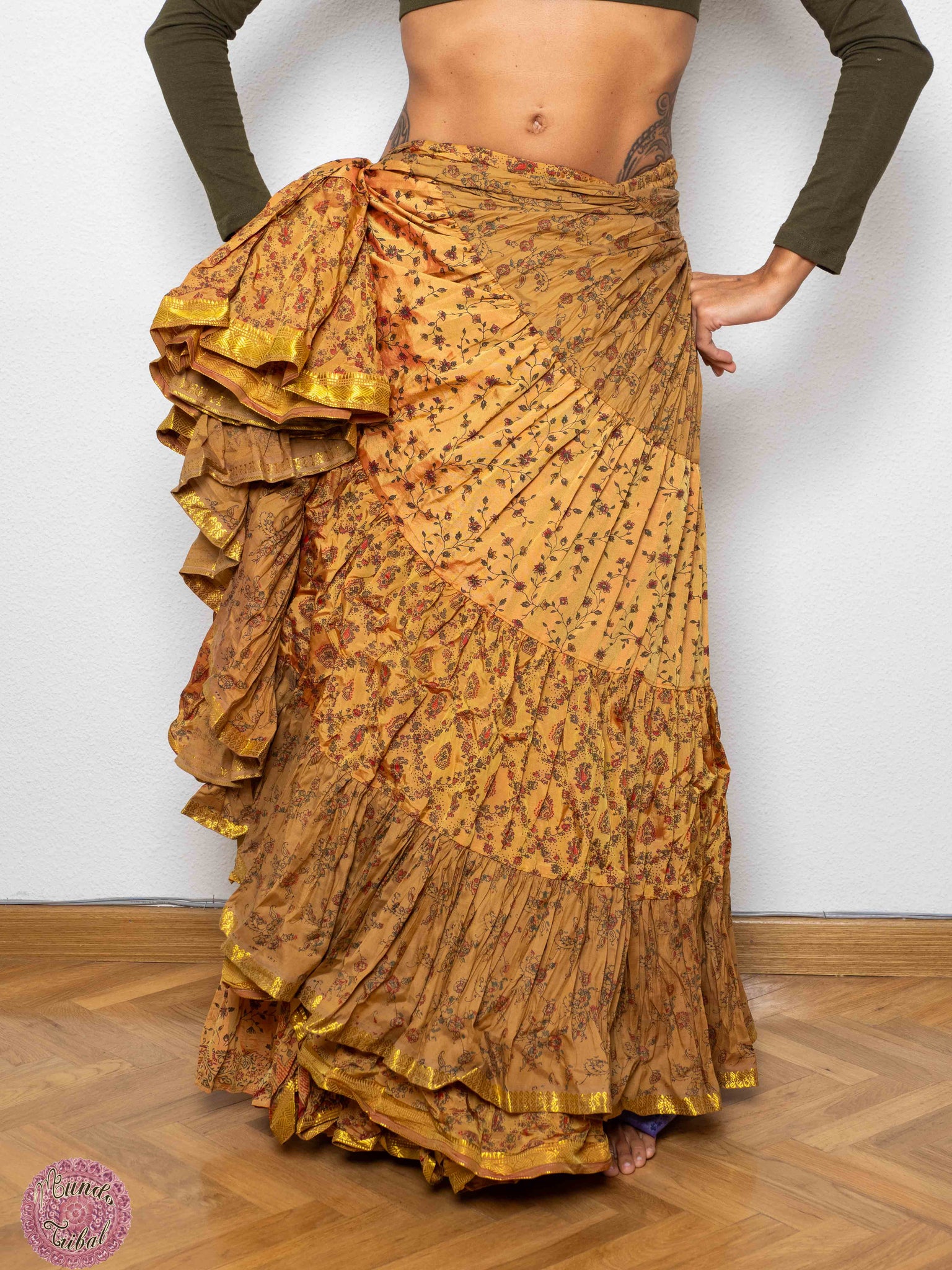 NOTA: estos saris son reciclados: sarees que han vivido su época como saree, y que los hemos reconvertido en esta espectacular falda. Al no ser tela nueva, puede presentar algún desperfecto. Si fuese el caso, suelen ser imperceptibles o muy discretos.