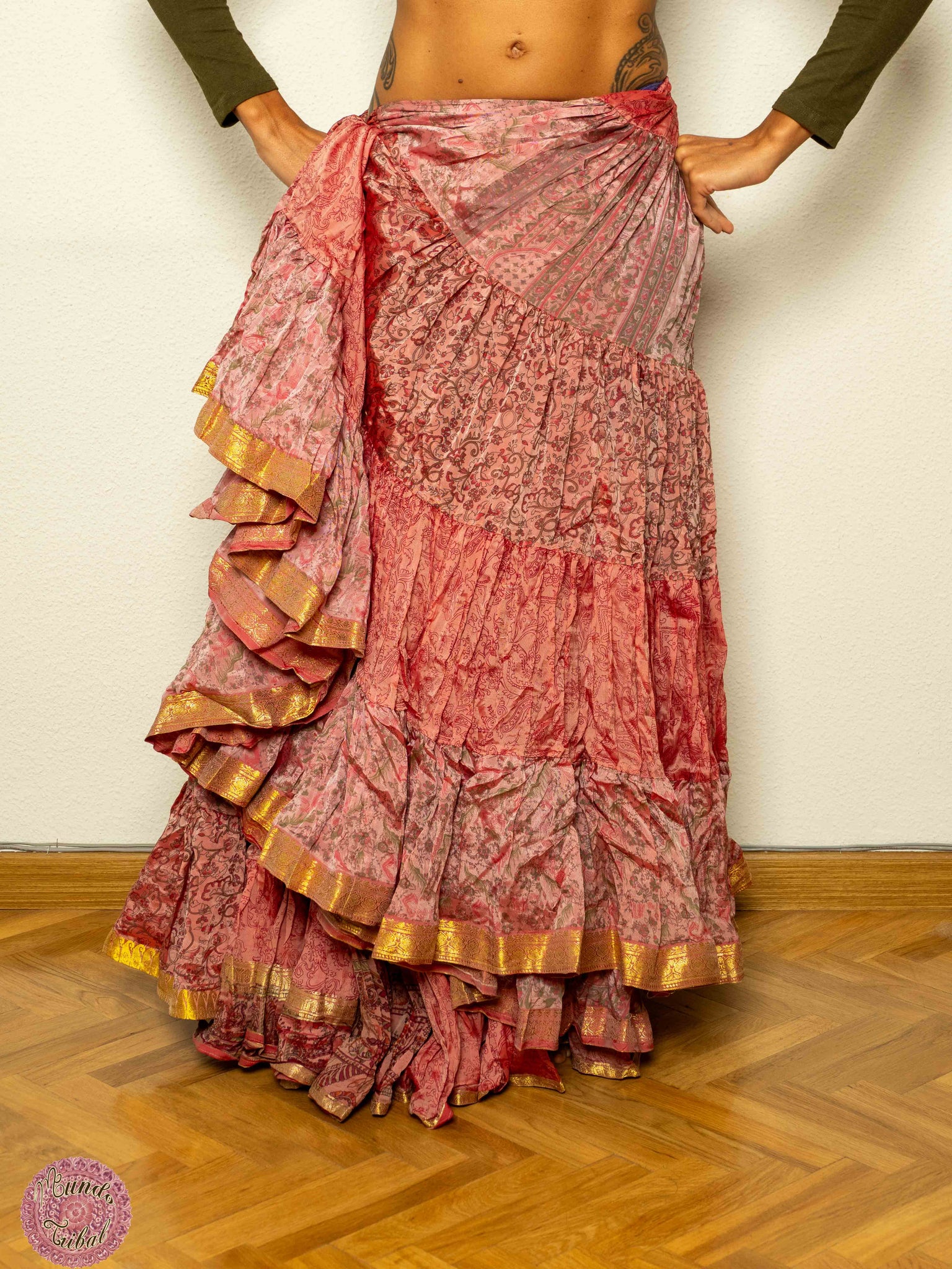 NOTA: estos saris son reciclados: sarees que han vivido su época como saree, y que los hemos reconvertido en esta espectacular falda. Al no ser tela nueva, puede presentar algún desperfecto. Si fuese el caso, suelen ser imperceptibles o muy discretos.