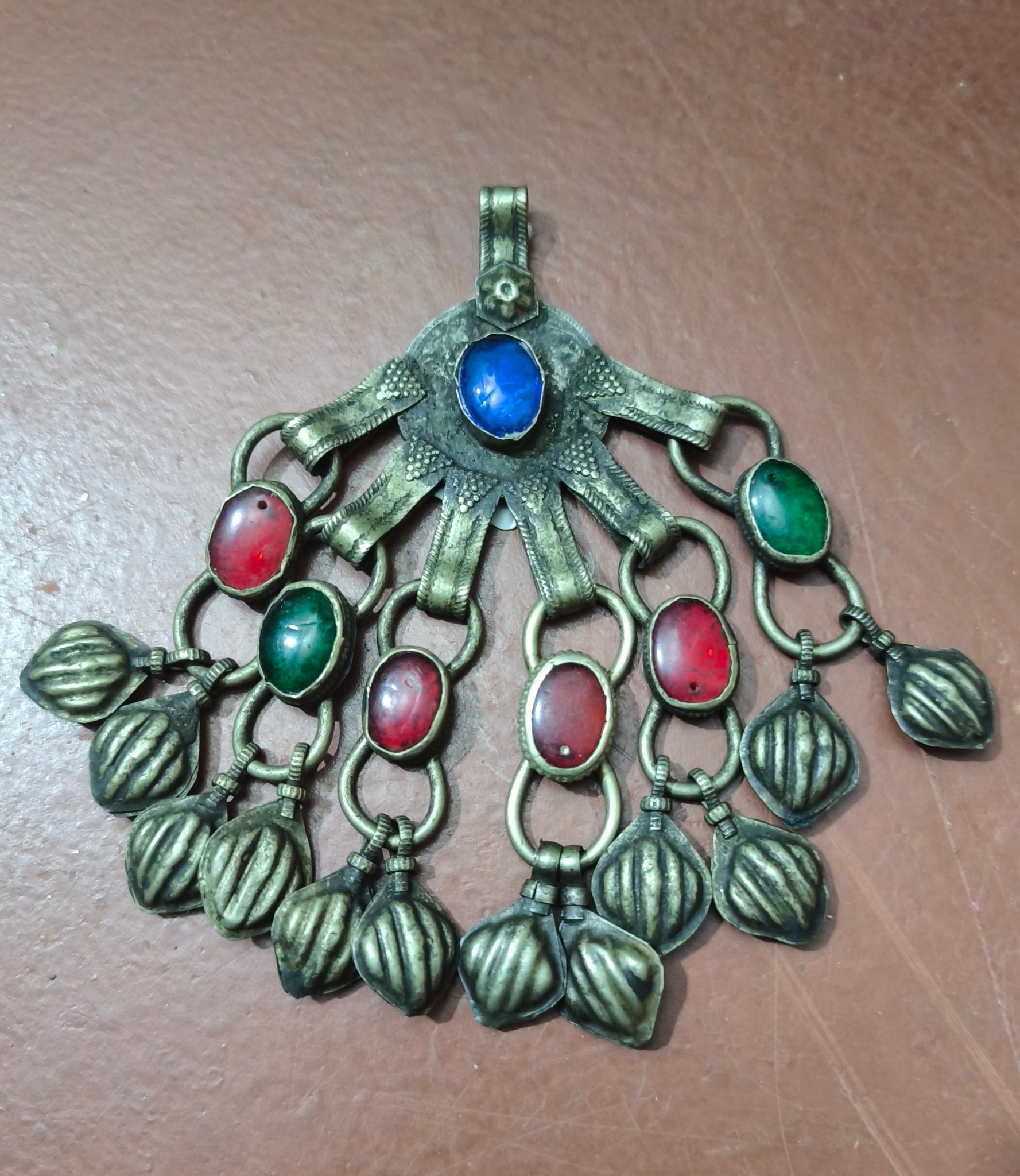 Forma triangular, con cuelgues de cadenas y piezas aplanadas en los extremos. Con piedras de colores. No hay dos Kuchis iguales.