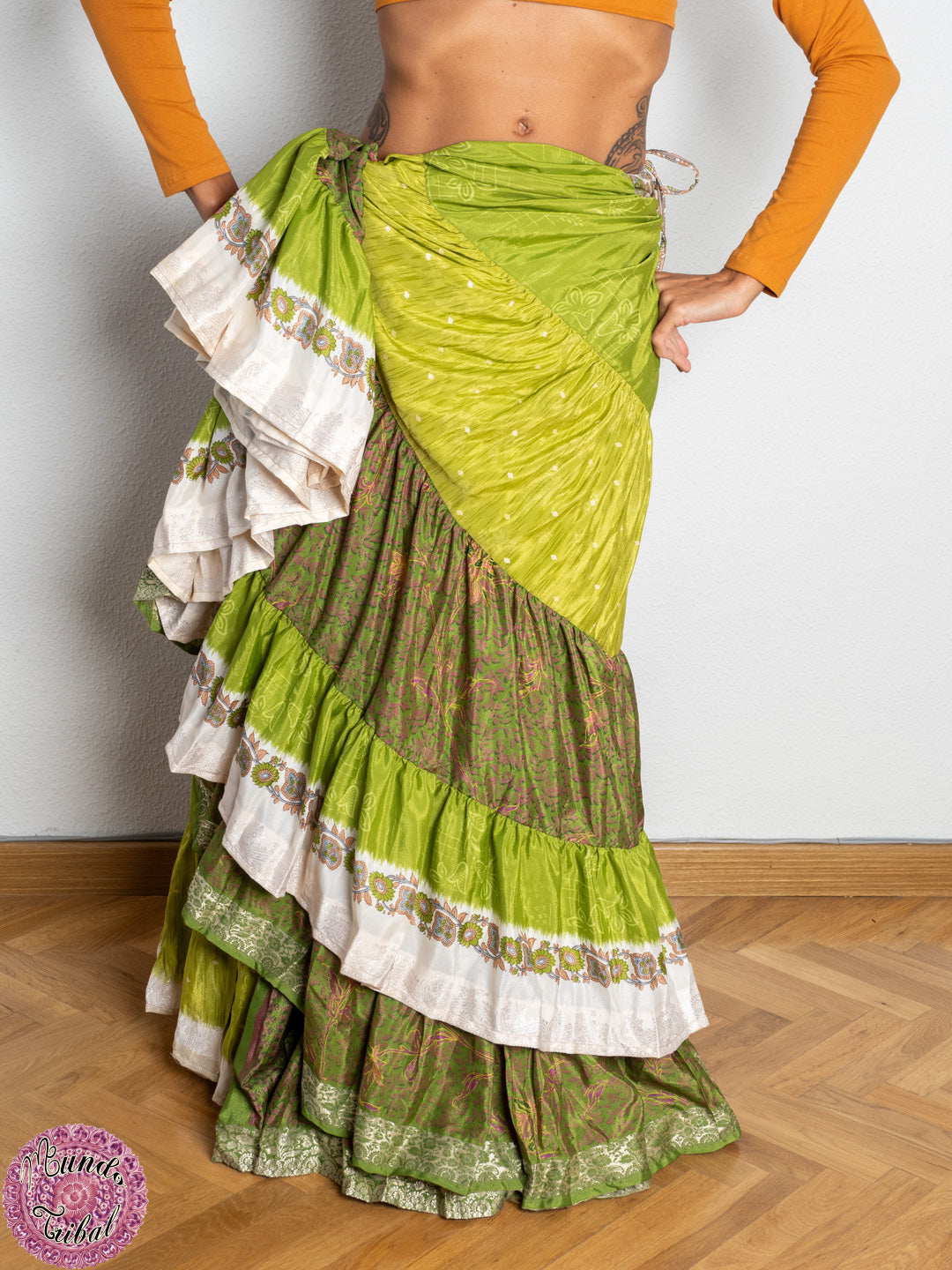 NOTA: estos saris son reciclados: sarees que han vivido su época como saree, y que los hemos reconvertido en esta espectacular falda. Al no ser tela nueva, puede presentar algún desperfecto. Si fuese el caso, suelen ser imperceptibles o muy discretos.